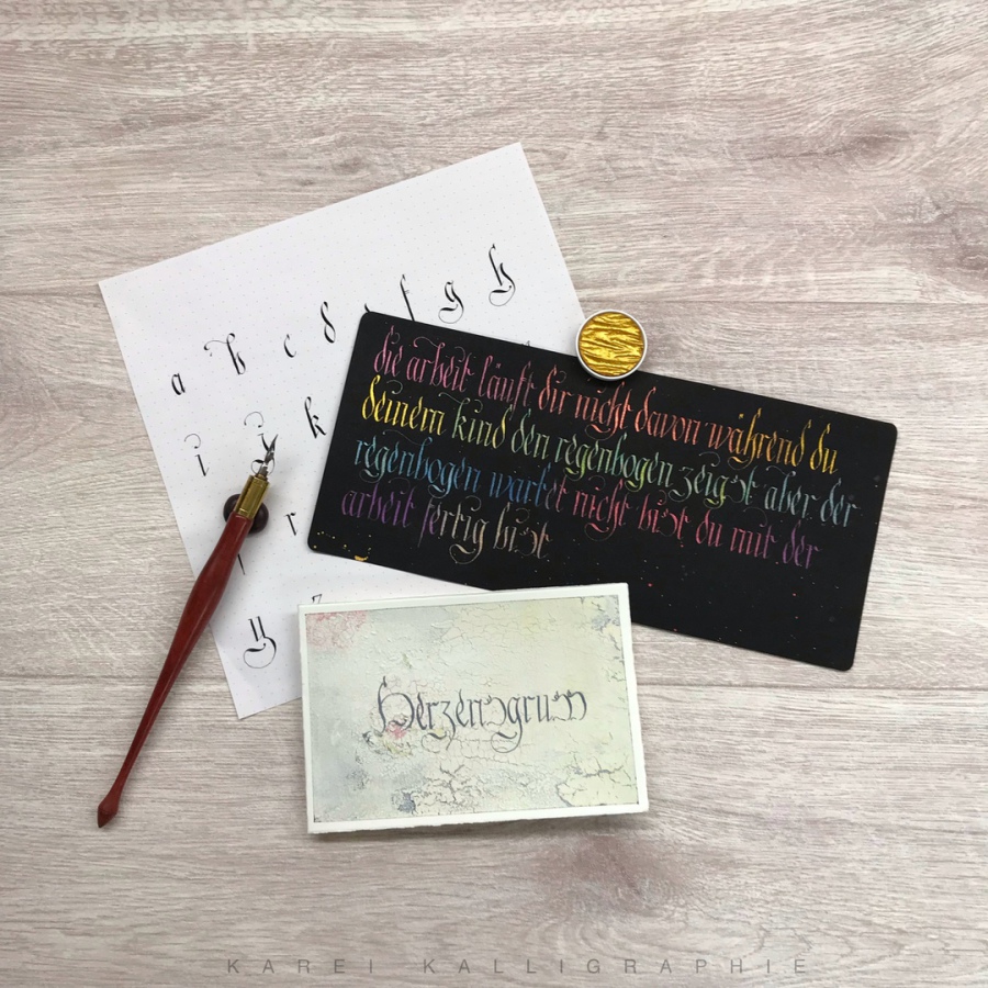 Spitzfeder, Federhalter, Eisengallustinte, Übungspapier und farbiges Zeichenpapier (LANA Colours u.a.) sind in der Kursgebühr enthalten.
